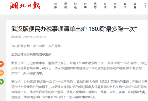 | 【湖北日报网】武汉版便民办税事项清单出炉 160项"最多跑一次" | |