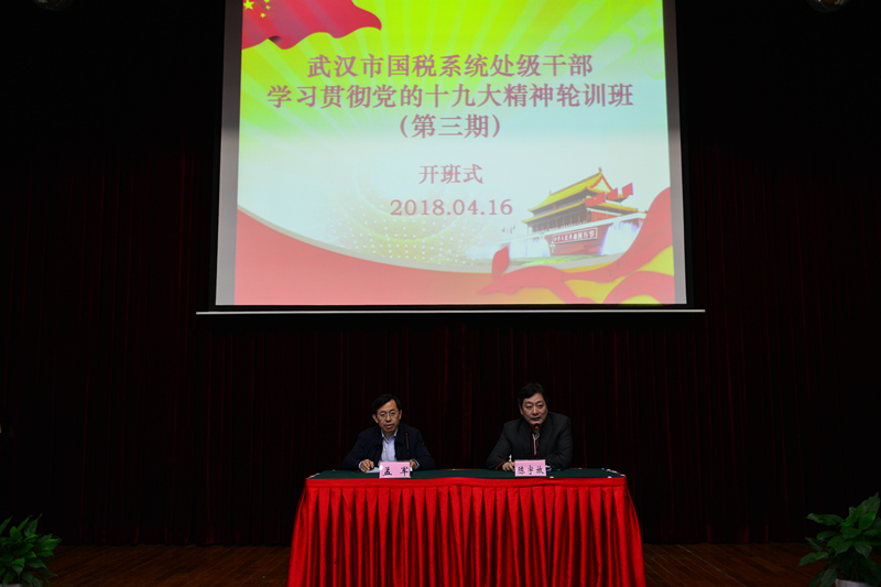 20180416-0419处级干部学习十九大轮训班(第三期)04.16上午,开班式 4月16日上午,全市国税系统处级干部学习贯彻党的十九大精神轮训班(第三期)在省税校武汉培训基地开班,各区局、直属单位、市局机关各部门主要负责人和部分副处级干部共77人参训。省国税局党组成员、市国税局党组书记、局长孟军参加开班式并讲话。